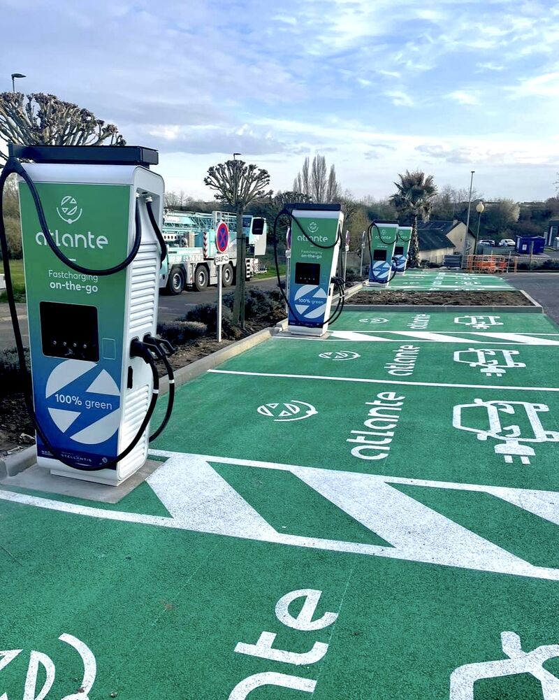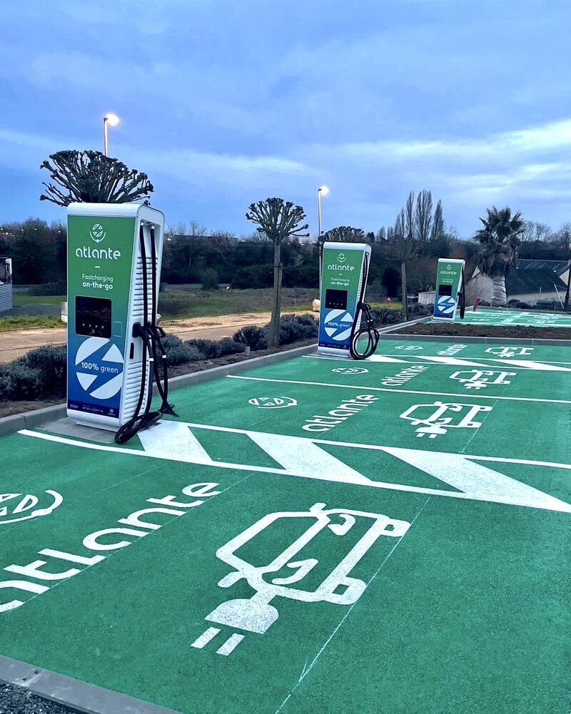4 bornes de recharge 150Kw « SUPERCHARGER » pouvant recharger en simultané 8 véhicules et ouvertes au public sur le parking du restaurant.